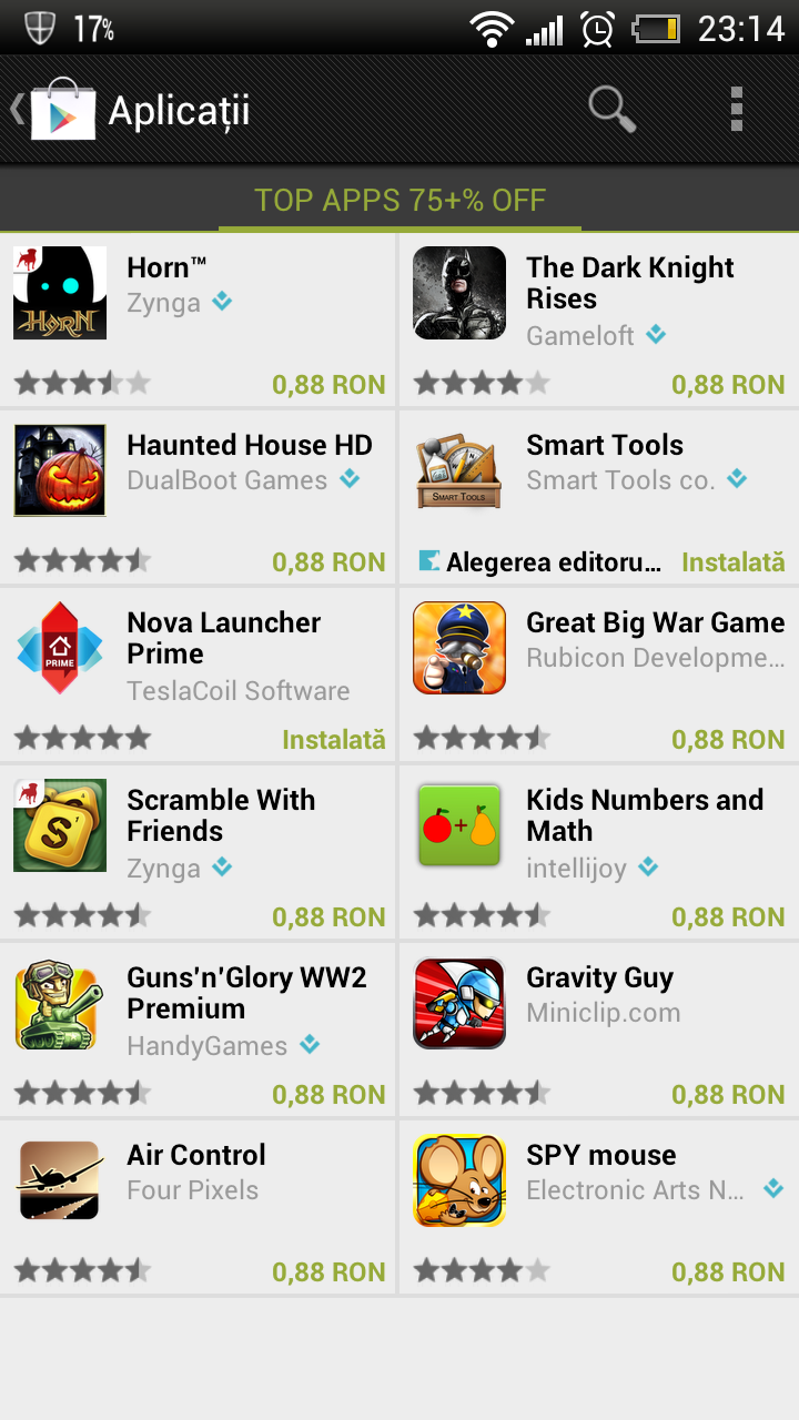 Cu ocazia celor 25 de miliarde de descarcari din magazinul virtual Google Play, gigantul american Google a oferit timp de cinci zile aplicatii la numai 0.25$, circa 0.88 lei. Aceasta e ultima zi si asa cum era de asteptat, promotia de azi se concentreaza asupra jocurilor. Daca esti gamer atunci ai ce sa incerci! Lista completa din oferta de azi o poti vedea AICI.