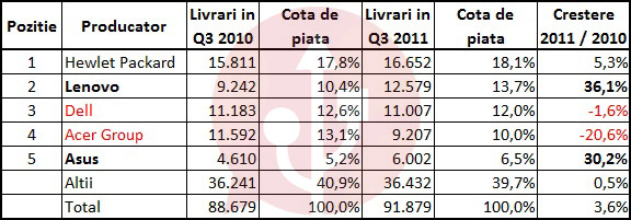 Conform ultimelor date oferite de IDC si Gartner topul primilor 5 producatori de PC-uri la nivel mondial s-a schimbat incepand cu Q3 2011. Singurul care si-a pastrat echilibrul si pozitia este fruntasul HP.