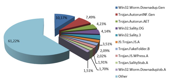 În ceea ce privește rata de răspândire, virusul Win32.Worm.Downadup este încă în topul amenințărilor informatice, la patru ani de la descoperirea sa, fiind responsabil de mai mult de 10% din infecțiile determinate în România. Pe locul al doilea se află Trojan.AutorunINF, o altă amenințare notorie, care deține o cotă de 7,49% din infecții. Aceste două amenințări au afectat numai computerele neprotejate ce rulează Windows XP.