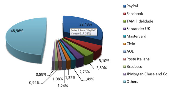 Phishing-ul și mesajele înșelătoare reprezintă aproximativ 2,5% din volumul de spam, iar instituțiile financiare sunt cele mai vizate. Majoritatea site-urilor de phishing sunt găzduite în Statele Unite ale Americii (circa 40%), Germania (6%), Brazilia (5%) și Spania (5%). Cea mai vizată instituție financiară este PayPal (32,4%), Santander UK (2,76%) și Mastercard (1,49%). În sectorul non-financiar, cea mai vizată companie este Facebook (5,10%), urmată de TAM Airlines (3,8%) și de AOL (1,24%).
