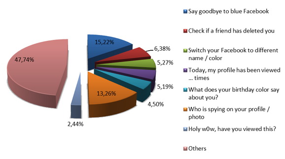 Pe Facebook, platformă care se apropie de 800 de milioane de utilizatori, infractorii informatici sunt mai activi ca niciodată. SafEgo, soluția de securitate Bitdefender pentru Facebook, detectează între 10 și 45 de escrocherii distincte pe zi, de diverse tipuri, descrise în graficul de mai jos: